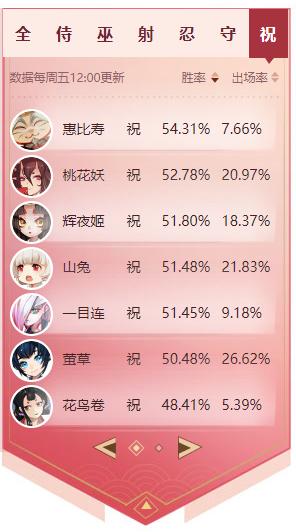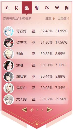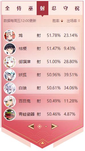 3、射类式神,鸩以灵巧的走位和继增的攻速保持着一贯的高胜率,而妖狐和白狼也维持这下路最高的主场率,胜率浮动不大。
