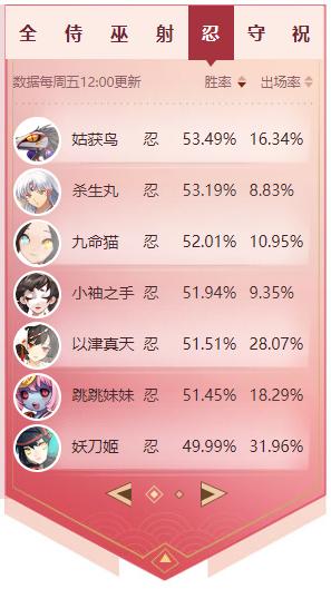4、刺客类打野,出场率分布较为平均,姑获鸟、杀生丸和九命喵的胜率占据了总榜的首页,玩家选用这些式神可能更易致胜。