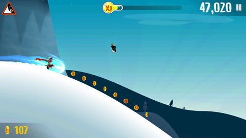 超强的速度感是本作的最大特色,游戏中有很多高速下落的坡道,玩家会一直感受那种速度的快感。游戏的画面虽不复杂但很精致,场景并非一成不变,而是会随着玩家滑雪距离的增加不断变化。