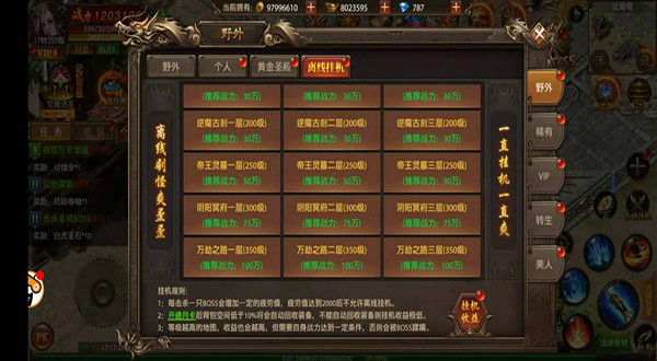 野外挂机:开服3天后开启离线挂机功能,一定要记得下线前选好挂机地图哦!除了丰厚的经验,还有大量的金币、元宝,一觉睡醒就暴富咯!