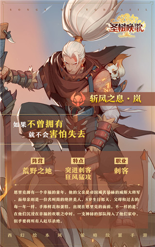 当师傅问起他的名字时,他说自己的名字已经和那些交织着幸福和痛苦的回忆一起消逝,因此拉斐尔给了他一个新的名字——岚。岚的刻苦和天赋惊叹了破风殿中的所有人,十三年不到,他便掌握了拉斐尔钻研上百年的“破风流”,并且开发了自己的剑道“斩风流”。他也渐渐融入了这个新的家庭之中。特别是小师弟兰斯,他总是喜欢跟在岚的身后,请教剑术时的认真模样,畅聊时的开怀大笑,都让岚感觉到自己拥有了一个弟弟,亲人一般的弟弟。