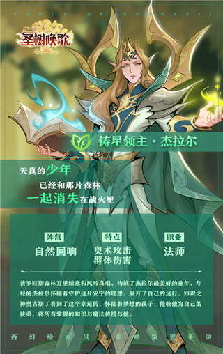 天资过人的精灵少年没有让自己的师傅失望,他早早得掌握了魔法的奥秘,并且非常善于运用自然的力量。奥古斯丁和杰拉尔两人亦师亦友,一起度过了一段快乐而平静的岁月。战争的利刃始终划破了这幅温馨的画卷,坠星之城的炮火轰袭着自然之森,杰拉尔不得不含泪告别自己的恩师,回去保护自己的故乡。\n##当他看到绿草如茵的故乡成为一片焦土时,杰拉尔无法掩埋心中的愤怒,他发誓让入侵者们付出代价,不过杰拉尔总是压制住自己的敌人,并不会痛下杀手。在漫长的战争中,杰拉尔加入了风暴女皇艾琳的军队。看到她的第一眼,杰拉尔便被这位美丽而骄傲的女皇所吸引,而杰拉尔神奇的魔法才华和善良,也得到了艾琳的关注。两人在战斗中逐渐相识相知,相扶相恋,率领自然回响阵营吹起了反击的号角,渐渐扭转了劣势。