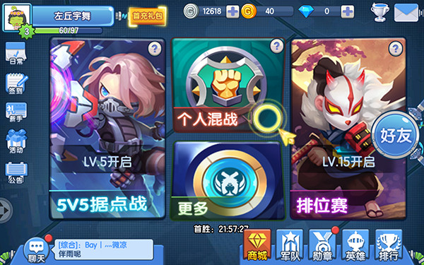 游戏的核心玩法就是冲锋激战,模式目前已经有个人混战、5V5歼灭战、5V5据点战、5V5夺旗战、1V1单挑、排位赛等。
