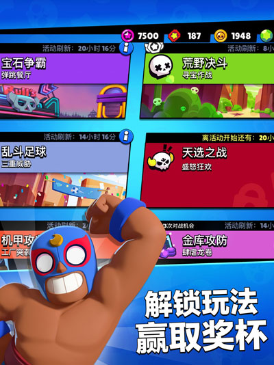 游戏主打3V3对战,并为此设计了多种游戏模式,在这里你可以与敌方展开一场激烈的宝石争夺战;可以制造机甲,合力摧毁敌人的炮塔;也可以到绿茵场上,来一场酣畅淋漓的足球比赛。若想要单打独斗,更是可以与其他9名玩家,在毒雾不断蔓延的荒野上,展开一场紧张刺激的生存之战。除此之外,还有超多有趣的对战模式,等待大家来探索。