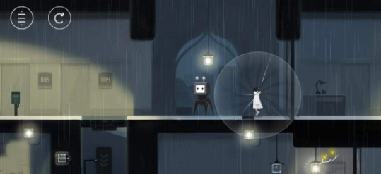 第一步:进入游戏画面,直接往右边走,用手指将前方的灯光拖到黑色灯柱处,然后去最右边吸收灯光,走到掉下来的灯柱处进入下一个场景。