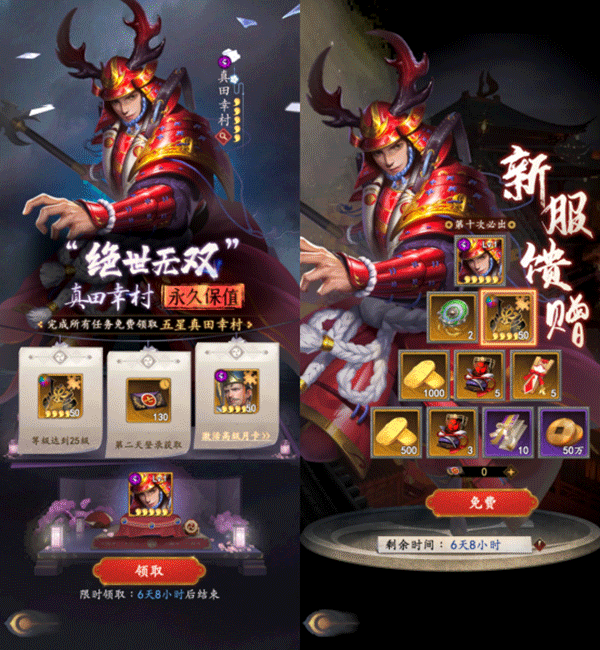 3、主力真田幸村无论是先手还是后手高爆发的群攻都非常强势,是开荒的一把好手。大家在开服活动里即可免费获得2个真田幸村,后续即便是非洲体质抽不到他,也可以通过购买每日礼包获得的将星积分来兑换,轻松升星。