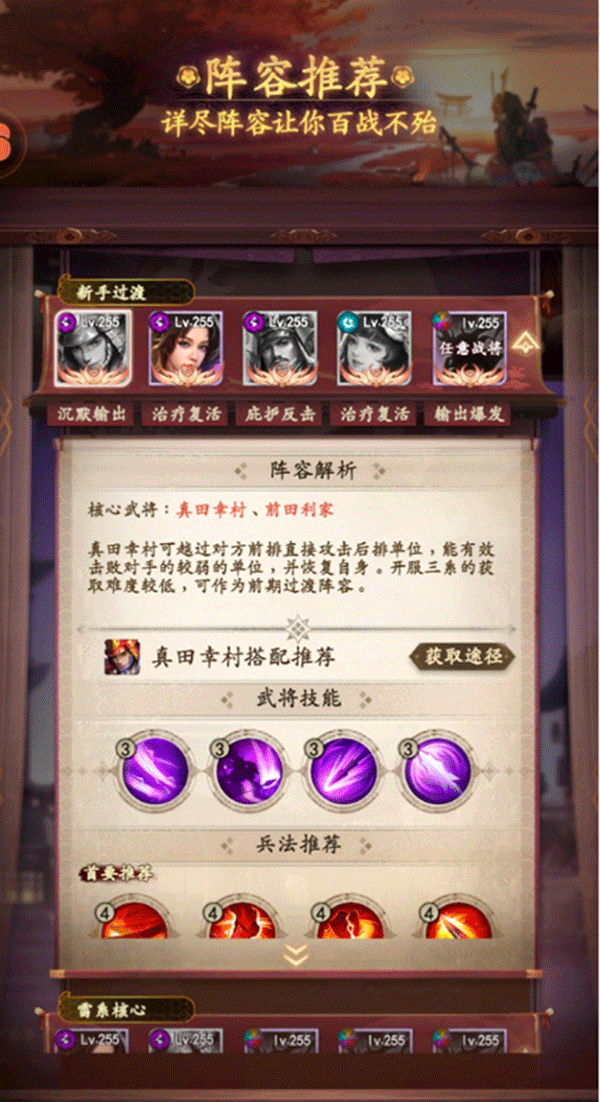 6、如果没有抽到本多忠胜,也可以用山本勘助组成双奶阵容。山本勘助在造成群攻法术伤害的同时还能回复血量,配合这个阵容可以轻松推图打越河合战、无限馆和远征。