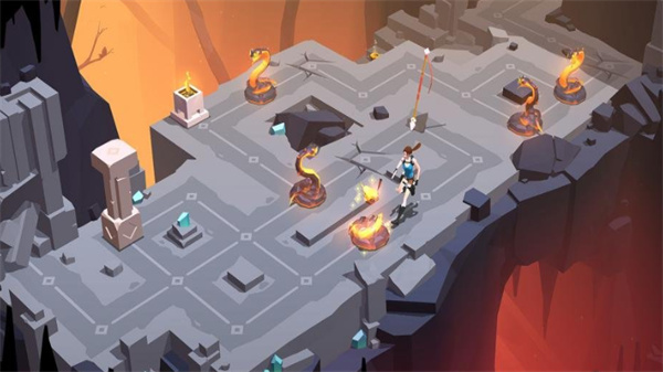 场景三的挑战依然在等待着我们,劳拉来到第一个小平台上时巨蟒就会发动攻击,我们需要向下方躲避一下登上最上方的高台处。爬上高台的一瞬间会吸引蜥蜴的仇恨,我们带着蜥蜴兜个小圈子并将立柱向外拖动一格。此时蜥蜴因为立柱的阻挡而失去尾随目标,我们可以趁机击杀掉它。接着我们将立柱推到下方空缺着的路口处,搭建一个临时的行进平台。跳下高台后再躲避巨蟒的一次攻击,即可顺利来到画面的右方。