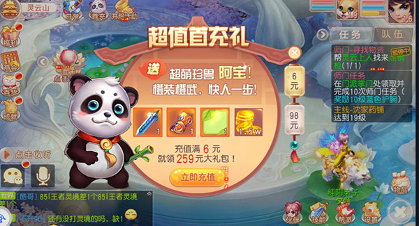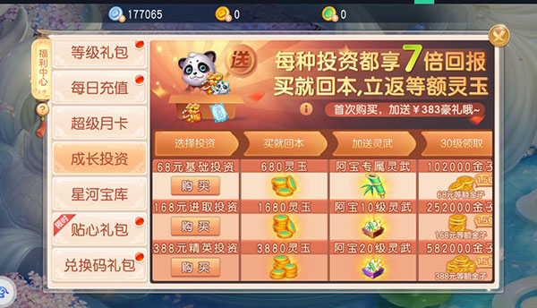 (新人玩家可以弄个首冲,送的宠物阿宝还可以,小r和中r玩家可以把月卡和三个成长基金买了,性价比比较高)。