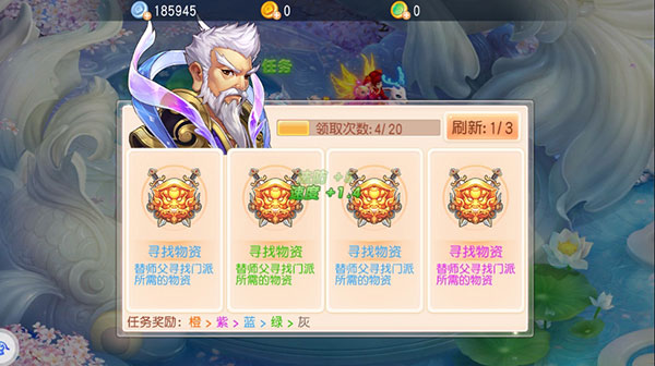 16级就没有主线了,我们就遇到了游戏里的第一个日常活动师门任务,每天可以做20次师门任务,经验奖励最高的是紫色任务>蓝色任务>绿色任务》白色任务