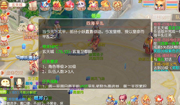 做完主线和师门任务就到30级了,然后就可以参加很多日常活动了。首先就是回合游戏最常说的抓鬼活动,也就是四海平乱,最少需要3个人,最多5个人组队完成,每天前40次获得多倍奖励,之后可以继续完成获得单倍经验奖励。(前几天每天可以完成220个,以后每天大概就100个左右,之后每次就几百经验了就没必要做了。)