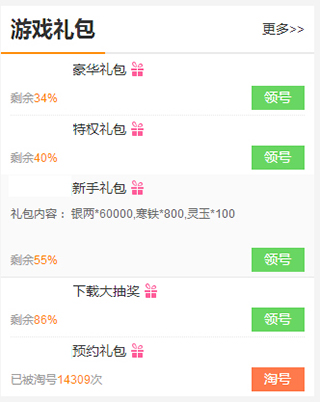 步骤3:或者直接查看“游戏礼包”,点击领号、淘号、预定即可;