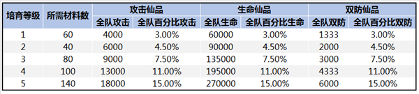 下面是从策划处拿到的培育属性表,想省事的各位魂师可以直接保存哦。表中可以看到,SS仙品的培育属性都是全队属性。如果穿戴一套培育到SS级的仙品,上阵的所有魂师都可以享受15%属性增幅。而且全队属性会在SS仙品培育完成时生效,无论是否装备。