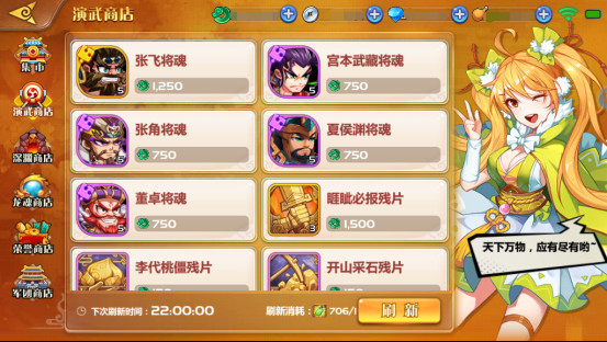 集市因产品众多,分为集市、演武商店、深渊商店、荣誉商店、龙魂商店以及军团商店。玩家通过各种手段获得代币后,便可在其中换得武将将魂。
