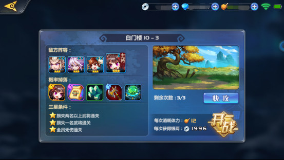 过关斩将:玩家可连续挑战多个敌人,每场战斗结束后,武将所剩生命值与能量值将保留至下场战斗中,每战胜一个敌人可开启一个宝箱,获得奖励。