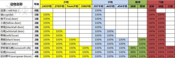 最后补上各种动物100%完整度枪支列表,新手请务必按动物等级选枪,以步枪为例,新手枪243打狍子,熊,黑白尾,黄鹿。看见罗斯福,驼鹿,牛请用338。你非要越等级打猎,请做好捡尸体跑500米的准备。