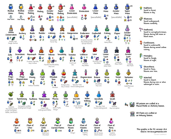 泰拉瑞亚合成表能让玩家们了解到药水和饰品、武器的合成制作方法,因此游戏宝小编为您带来泰拉瑞亚合成表大全图鉴,让大家有一个清楚的了解。