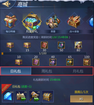 分为日、周、月礼包(例如每月限购1次),同时会有进度条奖励;