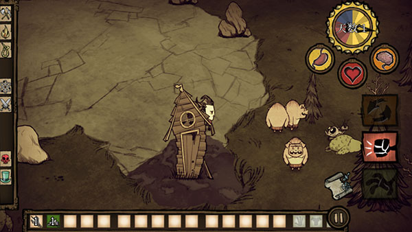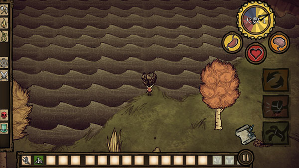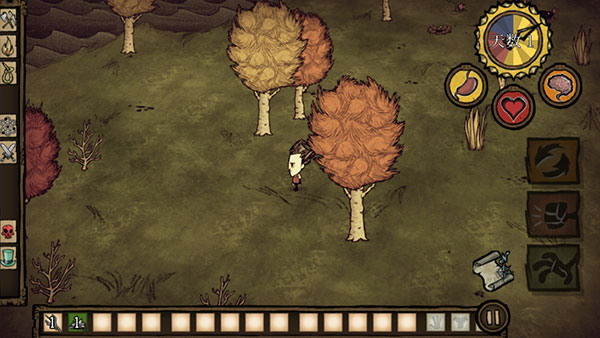 5、游戏就正式开始了,左边是控制角色方向的,右边是收集的,玩家需要收集一切能被利用的资源来躲避饥荒。