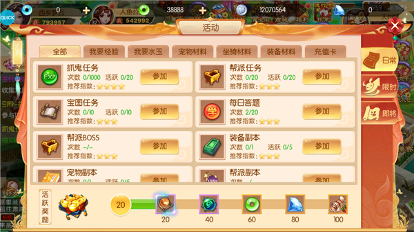 游戏的任务设置十分明确,玩家只要点击游戏界面左上角的“日常”按钮,就能参加自己感兴趣的任务,点击任务图标还可了解活动的开启时间、等级限制和活动奖励等信息。