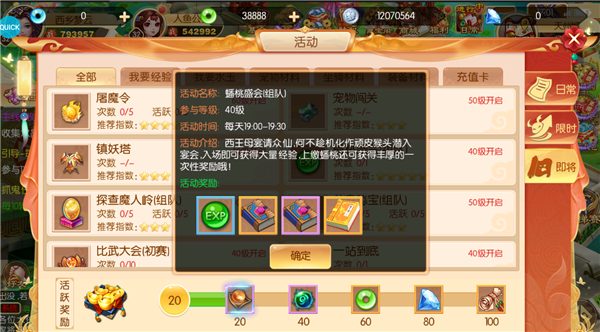 蟠桃盛会记得千万不要错过,只要参与就能获得海量经验。经验找回系统可以帮您找回最近几天错过游戏活动的大部分经验,有条件的玩家可以选择完美找回。