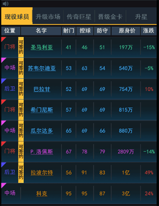 进行免费刷新,看看有没有涨跌值为负数的紫色球员。
