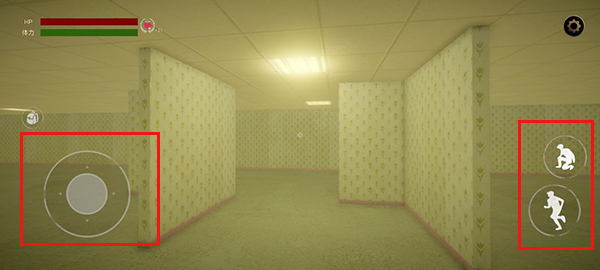 4、玩家可以看到左边轮盘控制角色的移动,右边轮盘可以蹲下、跳跃