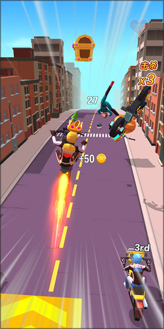1、下载安装好暴力摩托飞车,开始游戏时,所有人会在起点,每个人之间的距离相隔的并不是很大,尽量让自己保持在最后一位,这样你就可以攻击到每一个人了。