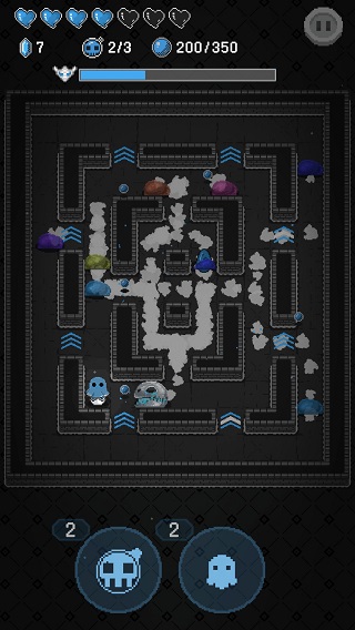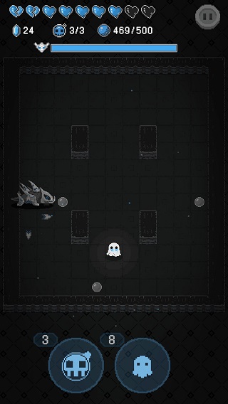 2、利齿骷髅:房间有一个回子形障碍,“回”外层空缺处为加速条,每隔一段时间出现灰色的蛋和怪物蛋,灰蛋数目逐次增加,boss吃灰蛋会增加一个灰白色小球跟随,到达6个随从变为彩色(随从移速加快),小球和boss行动轨迹带减速效果,角色吃灰蛋无效果,boss随时间扣血。