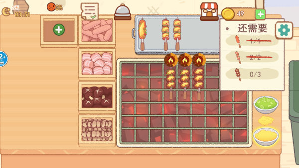 你要认真经营你的烧烤摊,根据顾客的要求,制作对应的食物