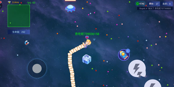 1、基本玩法在游戏界面中,玩家的左手操作圈是用来进行移动和改变方位,右手边则是控制加速技能的释放和停止。加速技能的释放会消耗少量小蛇的长度,要注意控制技能的释放。