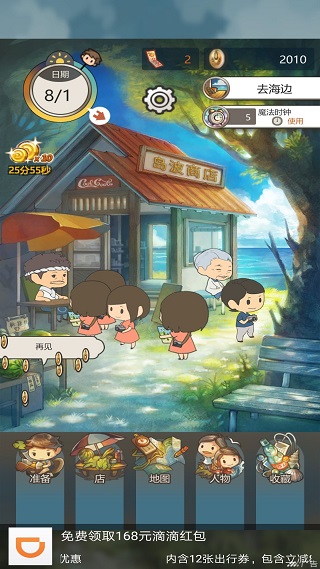 在(店)的位置,点击出现的客人,就可以得到钱币啦。为了能带着最好的食材,出游的更远,还是要稍稍挂机,不时点一点的~