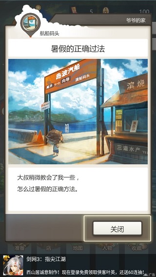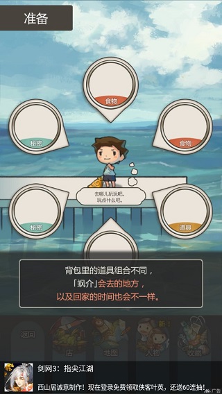 1、首先点击“准备”,背包里的道具组合不同,飒介君回去的地方以及回家的时间也会不一样。先点背包装些食物吧!