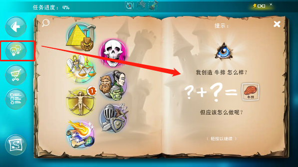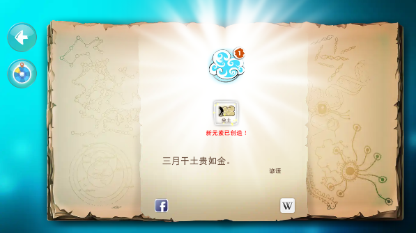 游戏有主线模式,任务模式和猜谜模式三种玩法。主线模式是围绕四种基础元素推衍万物的生成模式;任务模式是根据任务要求在指定几种元素中推衍出任务要求的物品;猜谜模式:从基础元素中找出谜底要求元素的推衍途径。这三种模式都可谓充满了挑战,主线考验我们的自由发挥,任务考验我们的组织能力,猜谜考验我们的逆向思维。