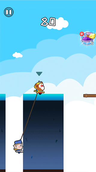 4、游戏中有两个角色,大家点击屏幕即可操控角色,如果一个角色掉下去也没关系,只有两个都掉下去才算游戏结束。
