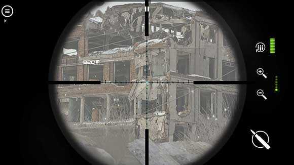 随后进入狙击手关卡,可以先仔细查看一下,但注意把握时间(从进入关卡到狙击手开第一枪之间间隔32秒),最好时开原倍镜不缩小,在狙击手开第一枪后,锁定期位置,开枪,任务完成。(狙击手放大图)
