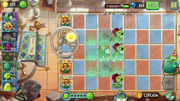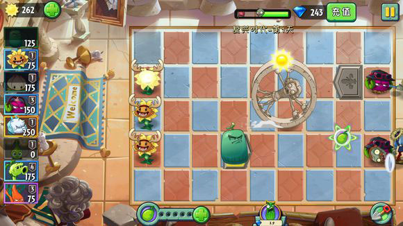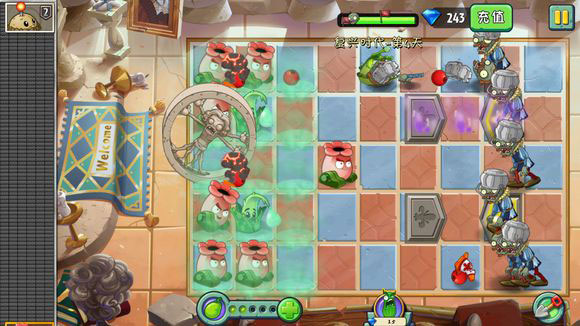 圆环滚动时途径的僵尸会收到持续伤害,最慢速度时可以打残相向而行的一阶铁桶