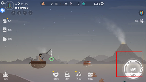 3、游戏的下方有养鱼池、鱼网、升级鱼竿、还有捕鱼袋,你可以选择自己想要选择的物品来捕鱼。