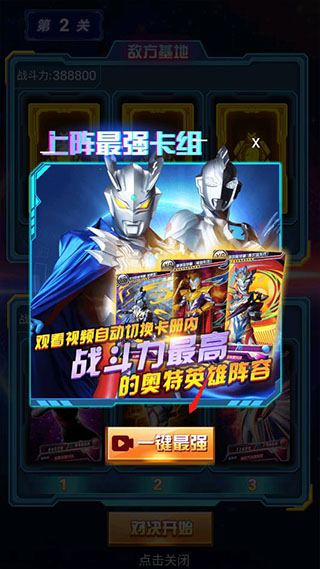 4、如果你不知道如何组建最强卡组,那么可以观看视频自动为你切换卡册内战斗力最高的奥特英雄阵容,本站带来的奥特曼抽卡游戏王免广告可直接切换;