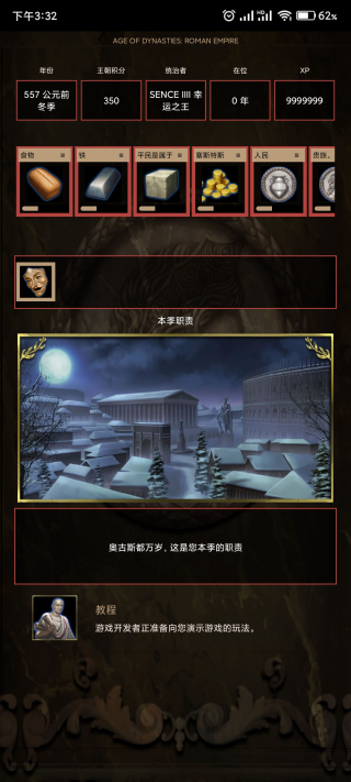 1、玩家需要带领王朝穿梭古罗马时代,通过控制国内的各种指标让王国保持平衡,保证王朝不灭灭亡2、各项指标显示在屏幕的上方,同时可以看到目前的年份,统治者的年号以及在位时间等信息