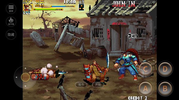 1、操作玩法左侧控制角色行动,右侧A:攻击,B:跳跃,C:道具选择,D:暗器释放。