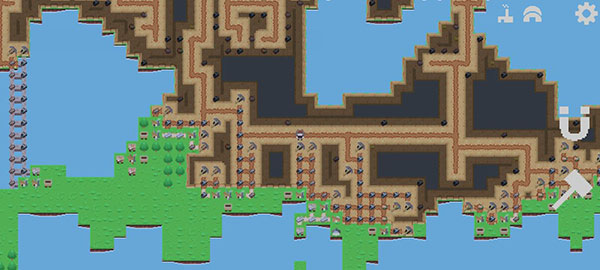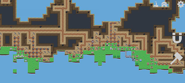 这里插播一下矿区的布局思路:先开图,挖隧道进山区,碰到矿就绕开,不要用路占矿,等图开的差不多了,再看矿的布局来考虑铁矿铜矿和煤矿的分布,尽量找靠的最近的金属矿和煤凑一对,导出到平原的物资尽量合成到最高状态,能直接合成到实验材料就不要转移到主岛上去,直接合成再开快递转移(毕竟快递车也是越来越贵的)如果海边的矿,也可以像我这样搭桥过河传输