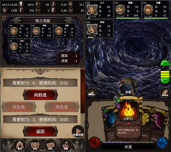 10、地图上的信息在尚未抵达时都将会是隐藏的,点击自身周围的格子即可进行移动,每次进行指令都会消耗耐力值,当耐力值耗尽时必须原地露营来进行恢复。