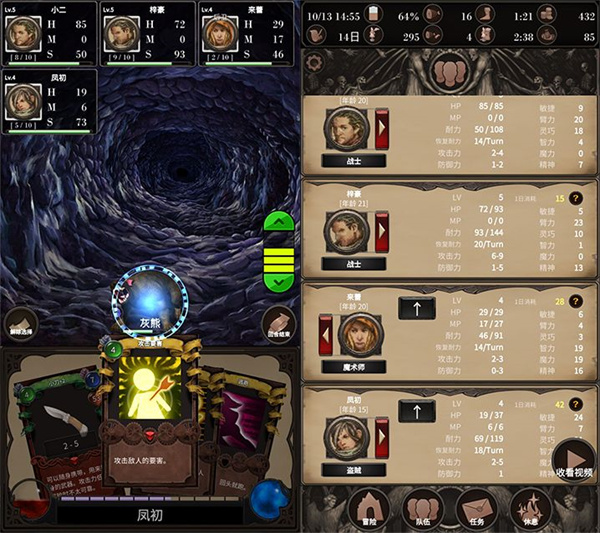 13、当来到地图中对应的地区即可进入迷宫。迷宫的玩法比较类似古早的地城RPG,玩家将在第一人称视角的迷宫中进探索。在迷宫中前进需要消耗时间与耐力,适当的休息在冒险中也是十分必要的。