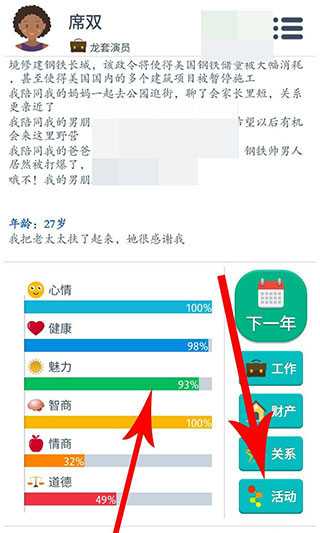 1、在游戏中,大学毕业之后,当您看到自己的魅力值偏低的时候,就急需快速增加魅力值,方法是点击游戏主页右下角的“活动”