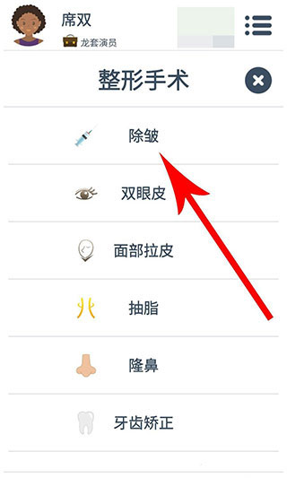 4、打开游戏的整容列表以后,可以看到有许多分类,此时点击第一行的“除皱”,然后点击“进行手术”