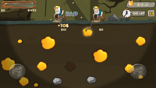 4、操作简单,在钩子摇摆的过程中,瞄准金子,点击屏幕时即会释出钩去抓取金子。