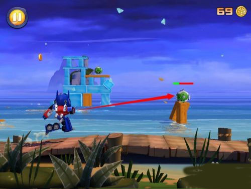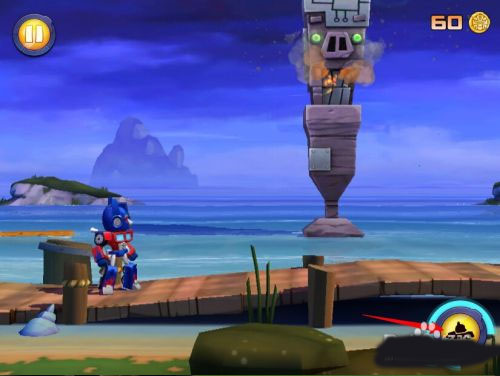 4、操控变形金刚鸟在跑酷时射击,消灭躲在障碍物种的机械猪。