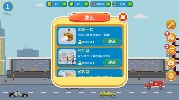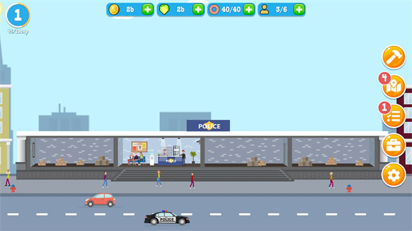 1、首先我们进入警察公司游戏中,进入游戏第一件事情就是赚钱,建造警局。