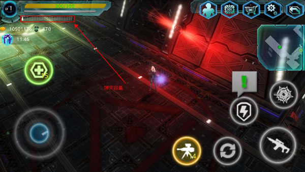 这款游戏的操作不是很难,进入游戏后玩家可以看到界面左下角有个圆环按钮,这个按钮是用来控制角色移动的,玩家想让角色往哪个方向移动就按住该按钮向哪个方向移动即可。玩家在移动的过程中要根据地面上绿色箭头的指示来,如果遇到异形生物的时候,玩家点击界面右下角带枪图标的按钮就可以发射子弹攻击目标,此外游戏中还提供了一个道具,那就是有黄色图标的机枪标志,当玩家点击该图标,就可以使用释放机枪塔自动攻击。